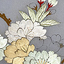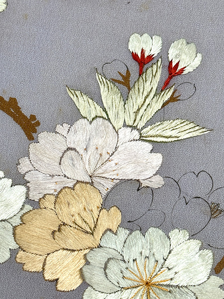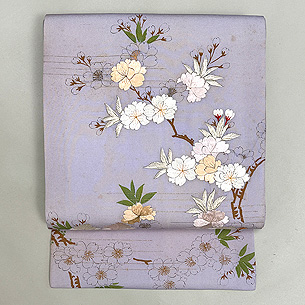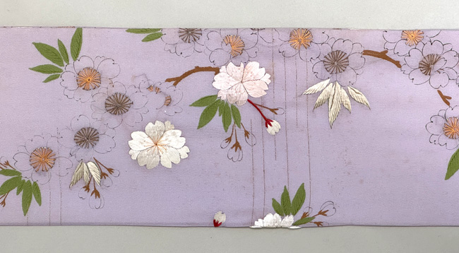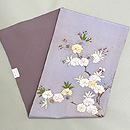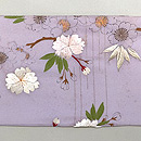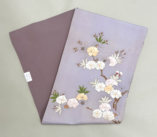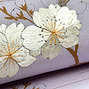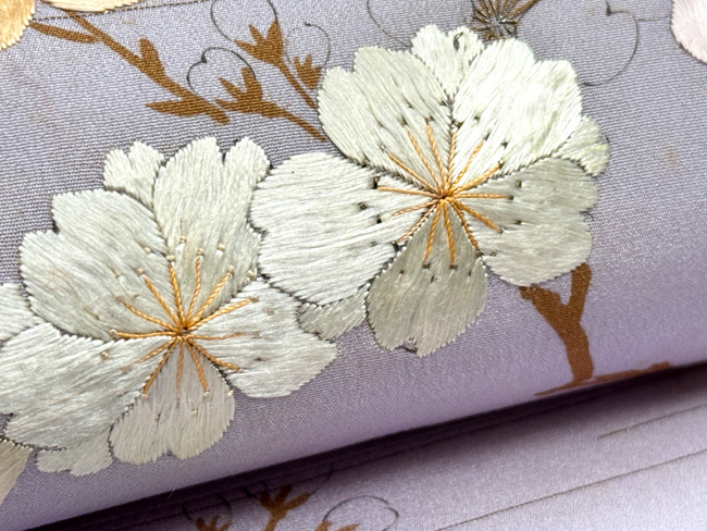薄いパープルの中に、刺繍の桜が輝きを放っています。 細く墨描された桜もまた対照的に繊細で緻密な趣があります。