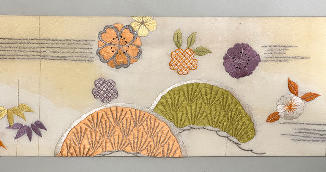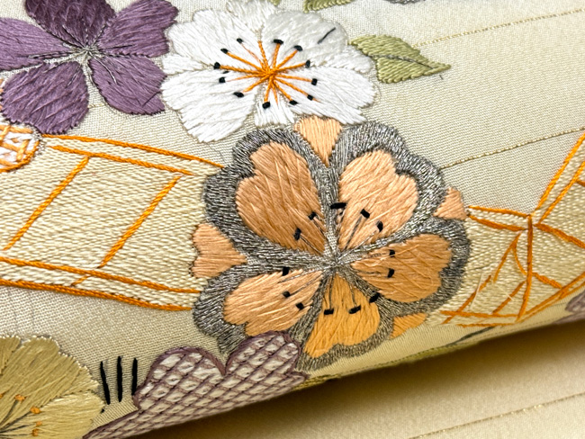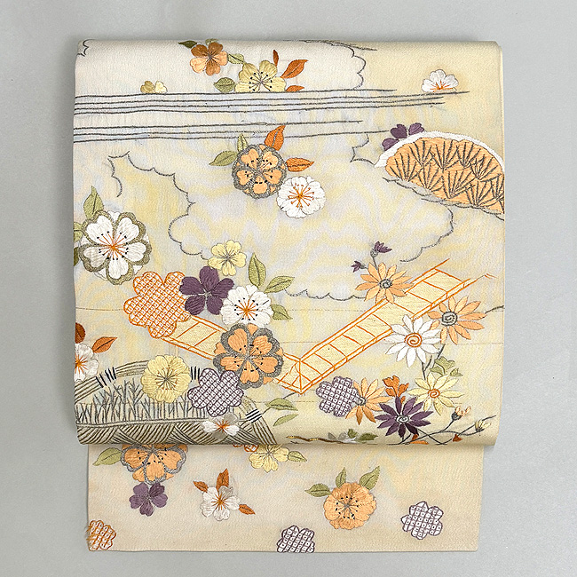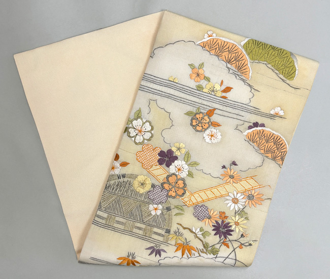 春の風景文様名古屋帯 帯24-02-20 ご売約済 長さ:9尺2寸(約349.6cm) 帯巾:8寸1分(約30.8cm)