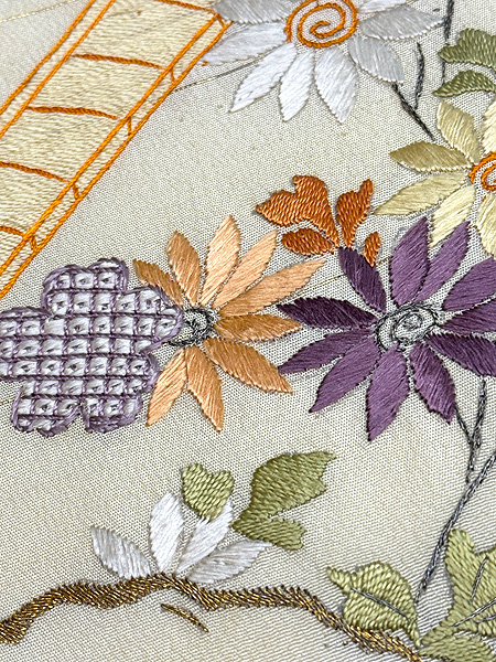 東屋に橋掛のお庭の情景が何かかわいくユーモラスに刺繍されています。 春のお出かけにのどかで明るいキャラクターが演出できますね。
