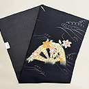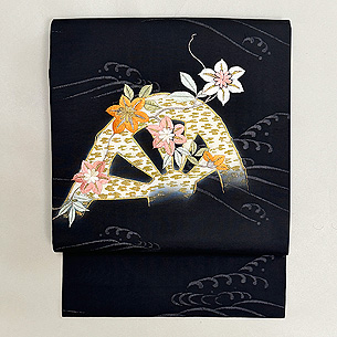 黒地片輪車文の名古屋帯