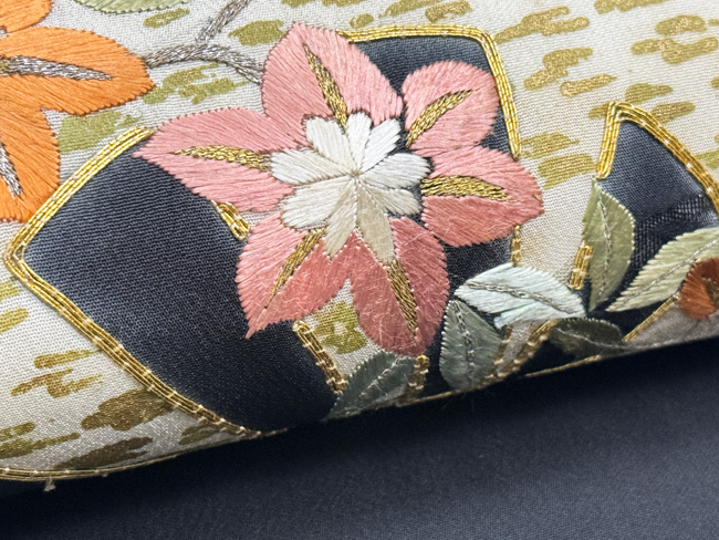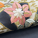 黒地片輪車文の名古屋帯 質感・風合