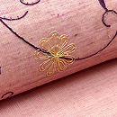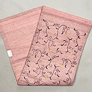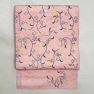 浅蘇芳色の地に紫の唐草模様をあしらった帯は、サリーを崩したものです。 ミシン刺繍で描いた唐草のところどころに金色の花が咲いて、モダンで軽快な雰囲気。 ごく薄い木綿の生地に芯をつけて仕立てているので、とても涼しげです。