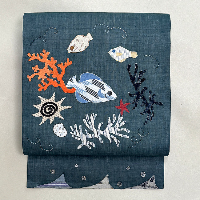 ブルー麻地海中文様コラージュの名古屋帯 帯24-06-63 ご売約済 長さ:9尺8寸(約372.4cm) 帯巾:8寸2分(約31.2cm)