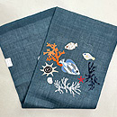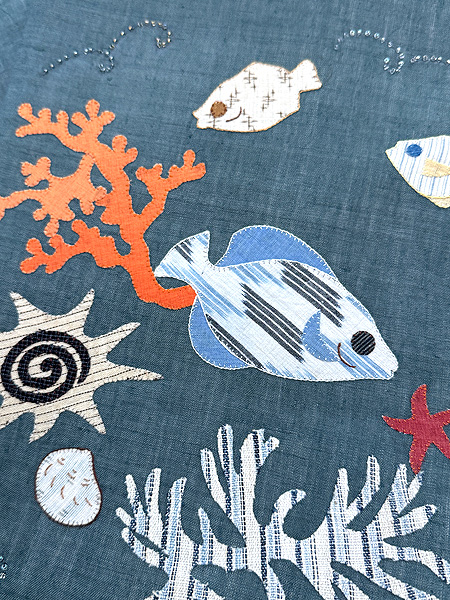 青い海の中をマイ天国!と泳ぐ魚たち。 珊瑚や波しぶきもかわいく揺れて、作者の自在な想いが伝わってきます。 麻地ですが、3シーズン大丈夫です。