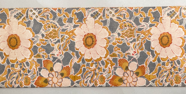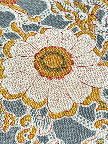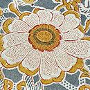 深いグレーに辛子色の取り合わせが新鮮な堺更紗です。 タレ先と手を同色の辛子色無地で締めたのが功を奏して、美しい帯になりました。
