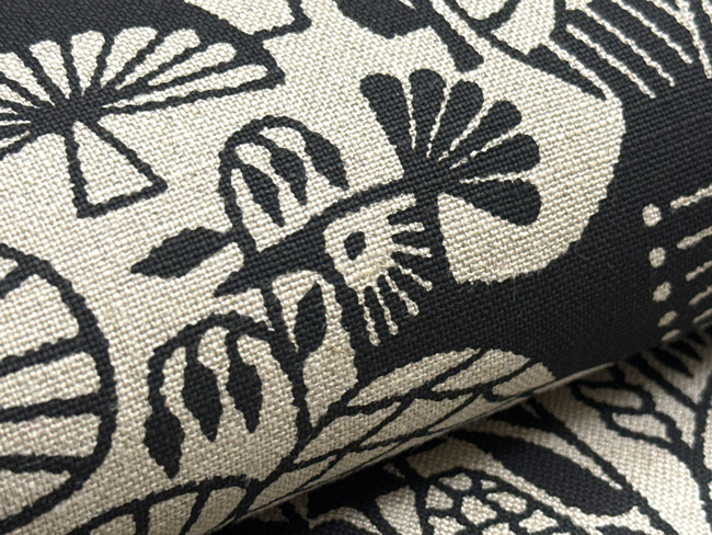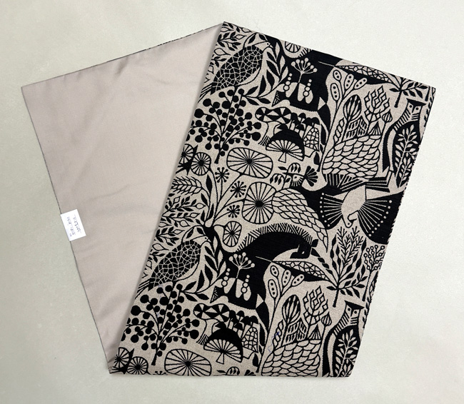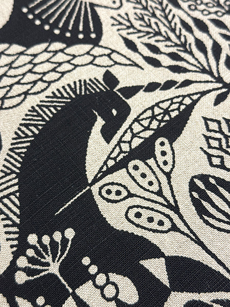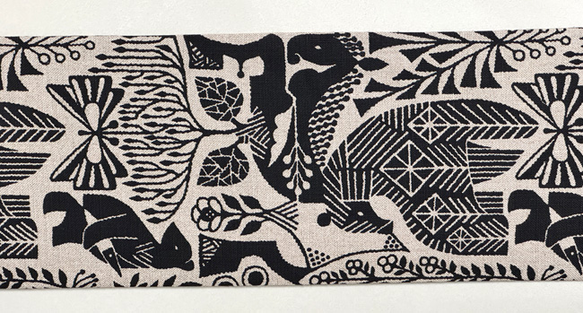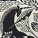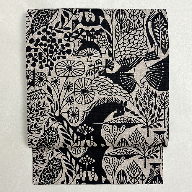 銘「森の精霊」とつけられた、日本のデザイナーのスウェーデンファブリックです。 森の動物たちが精霊となってファンタジーの世界を作り上げています。 控えめのきものに、帯で遊んでいただきたいです。