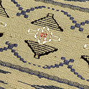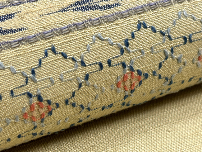 白みがかった辛子色に、縦よこの紋織でかわいい花文が並んでいます。 藍の濃淡に、紅花のはかない紅色が清楚で美しいです。