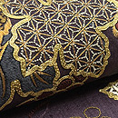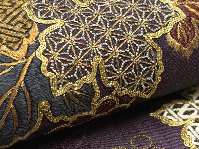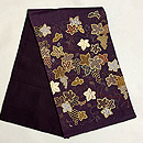 紬地に全て刺繍で葡萄の枝が広がっていますが、よく見ると、サンプルのように刺繍の種類がいろいろ詰まっています。 葡萄色に合わせた色使いがおしゃれです。 袋帯ですが、紬地なので普段使いにも活躍しそうです。