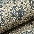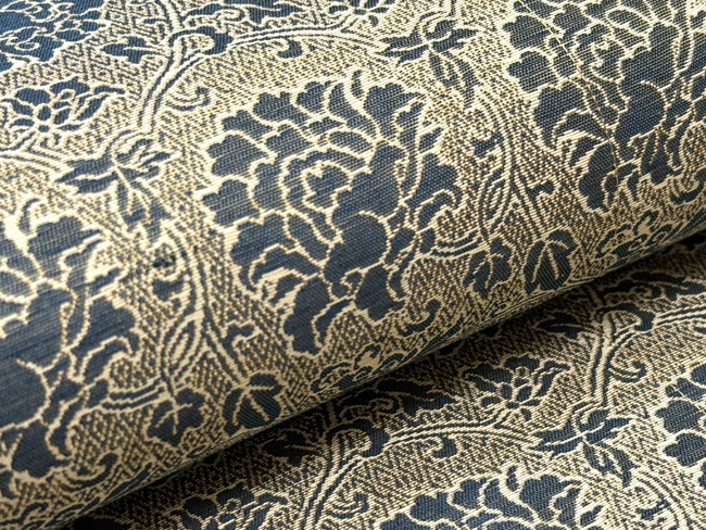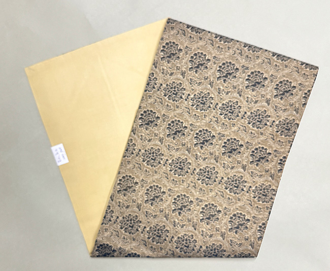 縦糸ベージュ、緯糸生成りに藍、少し金を絡ませています。 格調高く、静謐な趣の深い帯になりました。 表装裂からのお仕立てです。