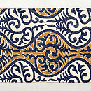 凛として格調の高いデザインです。白と金茶の中に、藍の線が美しい曲線を放っています。 結城など素材感のある紬に合わせて、着物の格を高めてくれそうです。