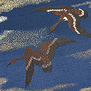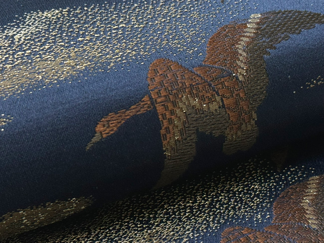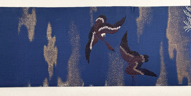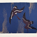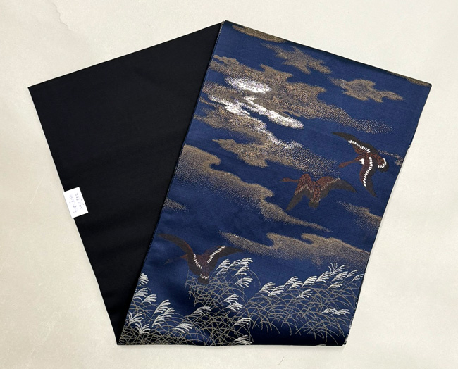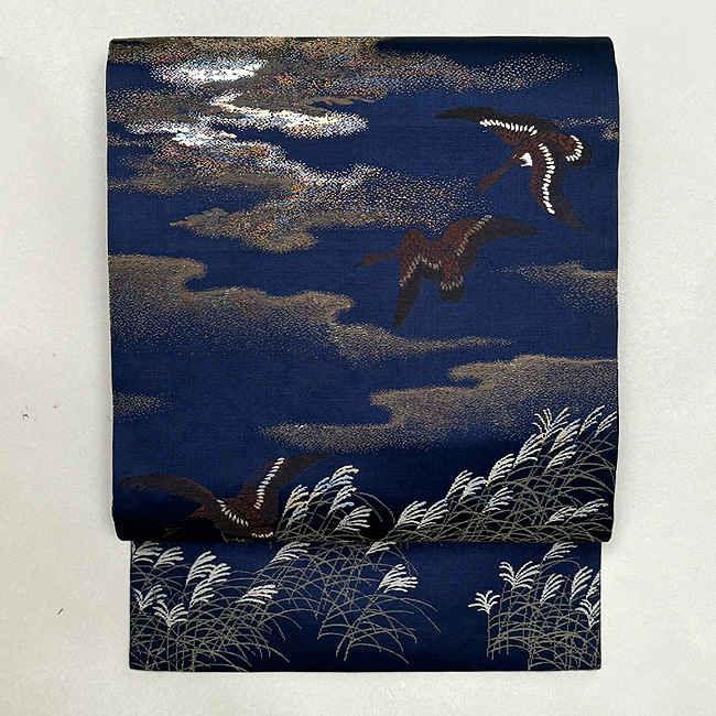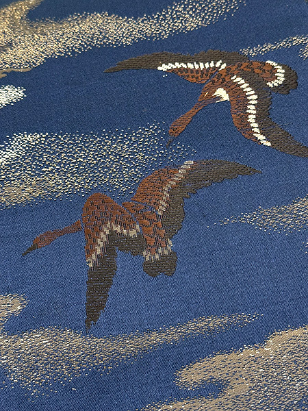 雲間に残照の残る青空を、ねぐらに急ぐ雁の群れ。 この色には明治期の名残がかあります。 当時は、重くて幅のある丸帯を小さな体に巻いていたのでしょう。 名古屋帯にお仕立て直しをしてます。