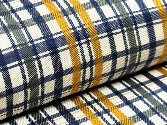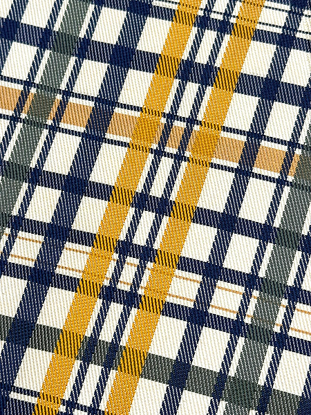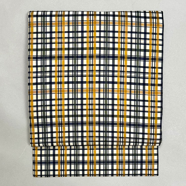 渋い紺に辛子色、と珍しい色味の格子帯です。 都会的なセンスが光ります。
