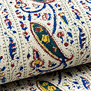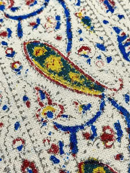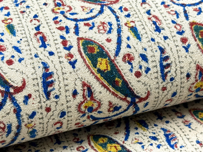 手紡ぎ木綿に素朴なブロックプリントの更紗です。 赤と緑のかわいいペーズリーがお行儀良く並んでいます。