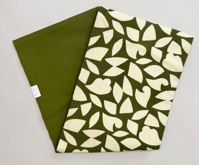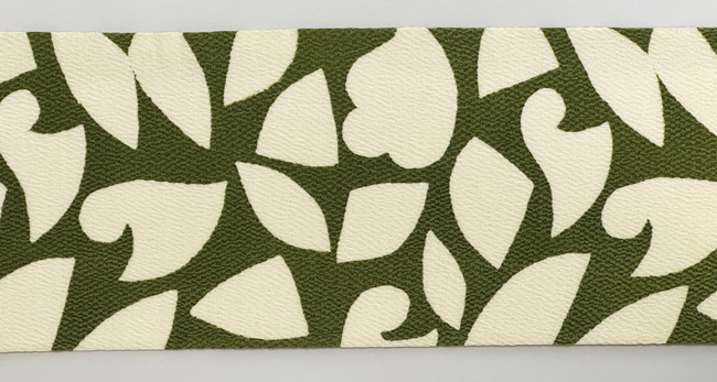 萌黄色のしののめ縮緬に、キュートでモダンな文様がびっしりと詰まっています。 使うほどに愛着が増していく、そんな柚木さんの言葉が、ほほえみと共に聞こえてきそうな 楽しい帯です。丈については、ご相談下さい。