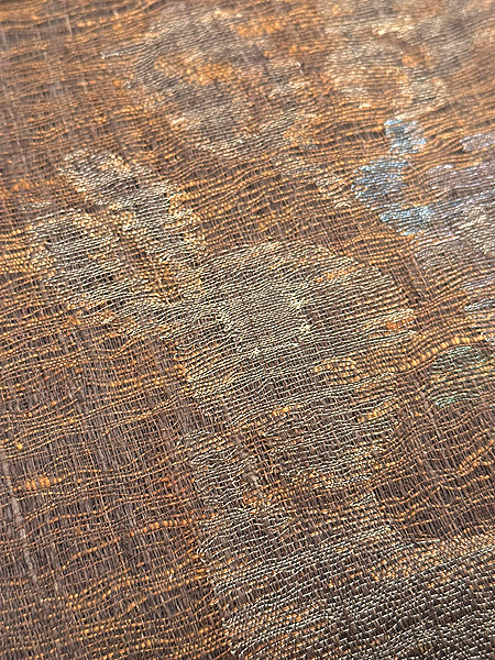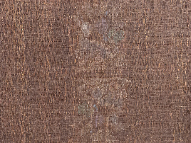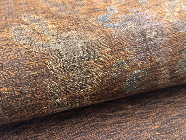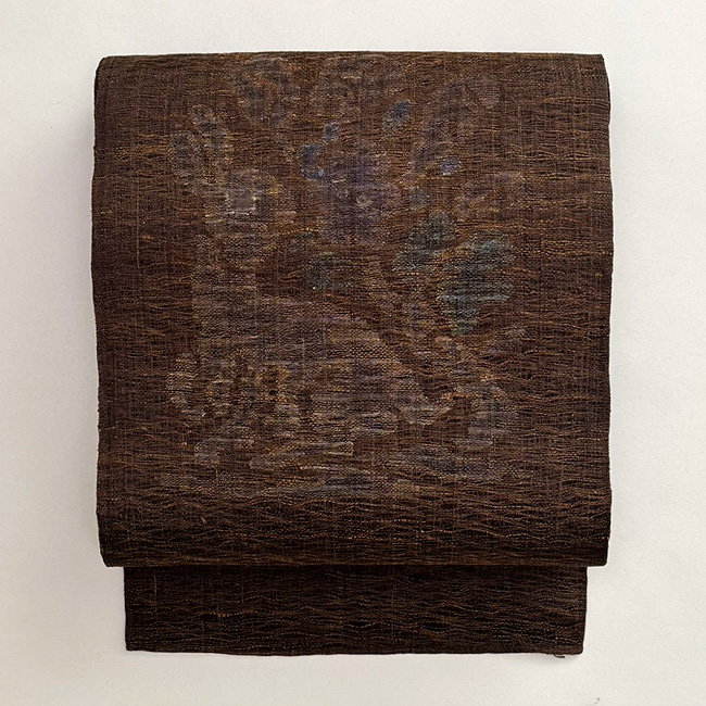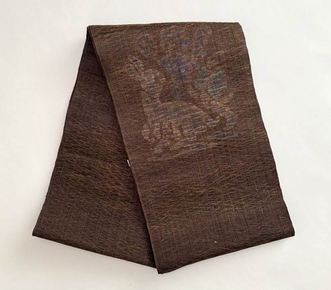 平織りの上にゆらゆらした緯糸の波を重ねて透け感溢れるゆらめきが魅力的な軽い夏帯です。 中に花兎の大きな文様を織り込んでいてオシャレな装いを楽しめますが、裏を使って無地帯としてもお使いいただけます。
