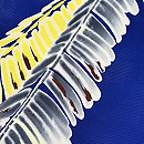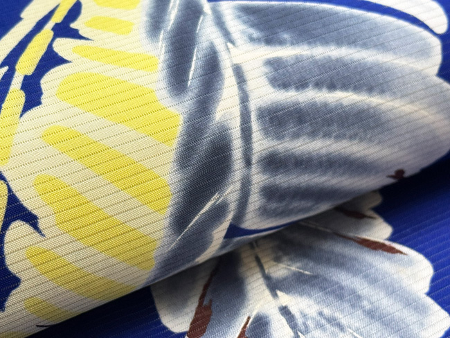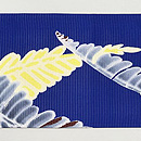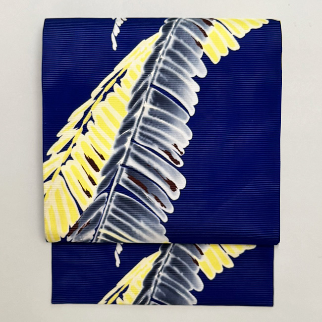 紺藍の鮮やかな地色にだいたんに芭蕉の葉を染め上げた可愛い名古屋帯。 カジュアルな装いに、人目を引く艶やかさです。 上質な浴衣にもいかがでしょう?