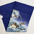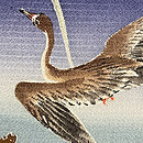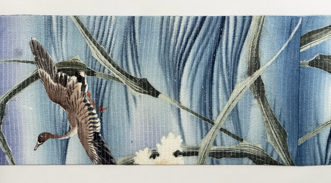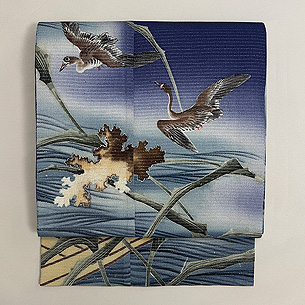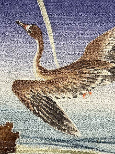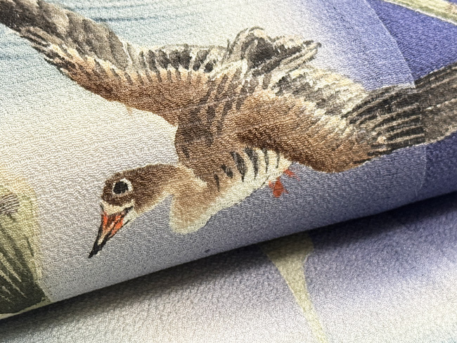 舫舟の置かれた岸辺に、雁のカップルが飛んできました。 達者な手描きにより、雁の姿が凛々しく美しいです。 着物崩しの絽縮緬です。