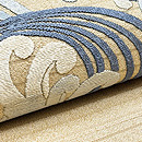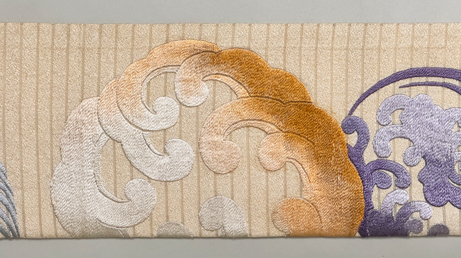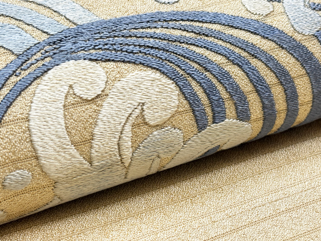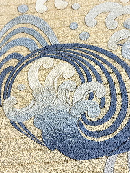 絽の透かしが大きく間をあけて入った地厚の素材に、大きな波の丸紋がぽってりと刺繍されています。 芸妓さんの丸帯だったのかもしれません。 名古屋帯にしましたが、付下や訪問着にもお使い頂ける格上の趣があります。