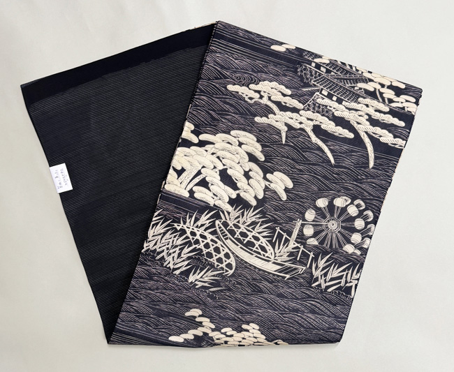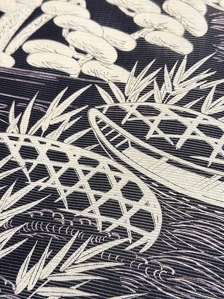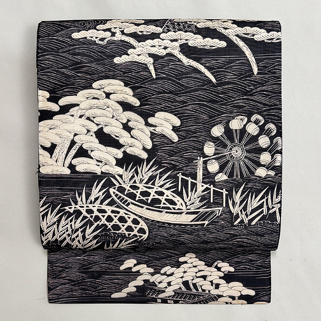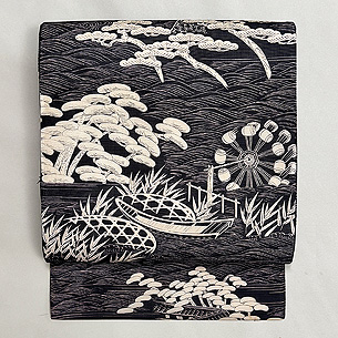 水車、蛇籠、舟そして松原。 今では見ることができなくなった水辺の風景。 帯や着物でこそ纏うことができる日本美しい風景ですね。