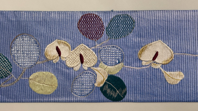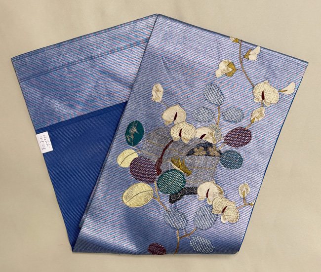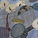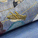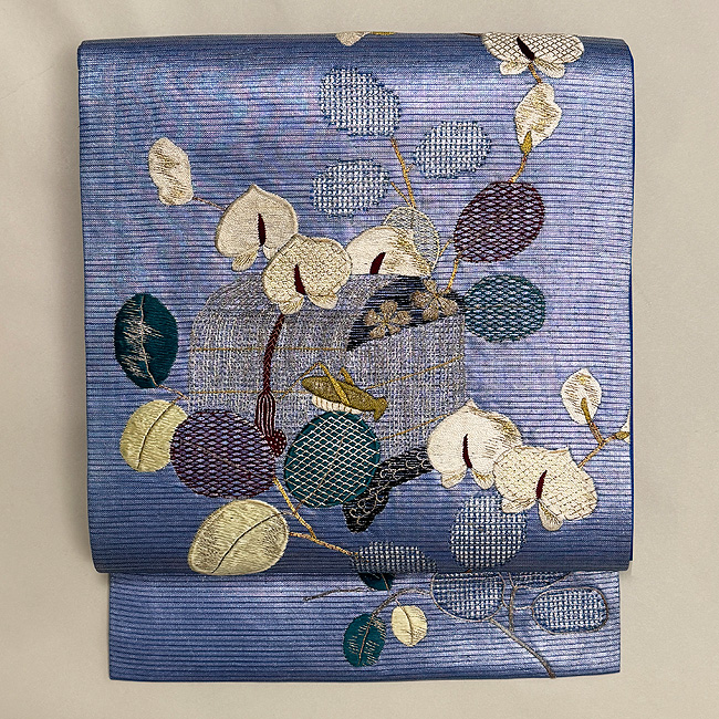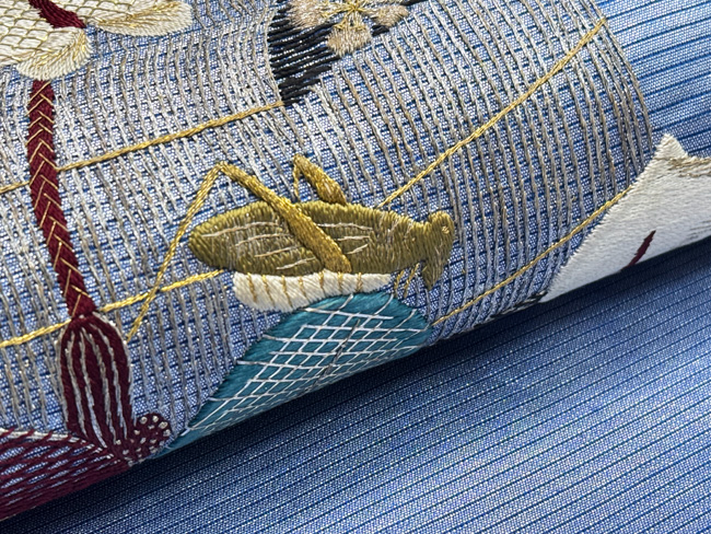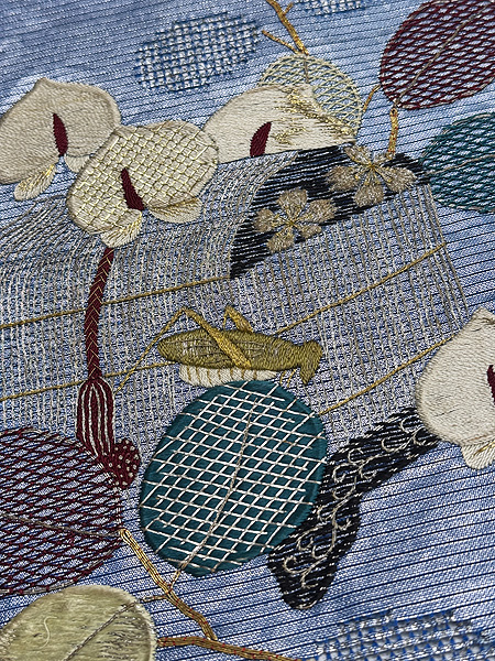 銀糸織りの上に、大きくて複雑な刺繍をふんだんに入れた豪奢な名古屋帯です。 カゴのそばには鈴虫が1匹。 涼を呼ぶお出かけ帯です。