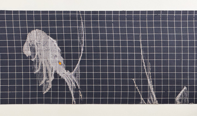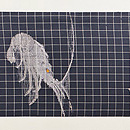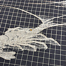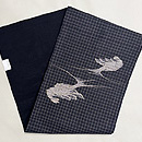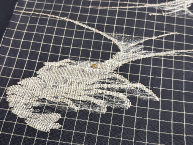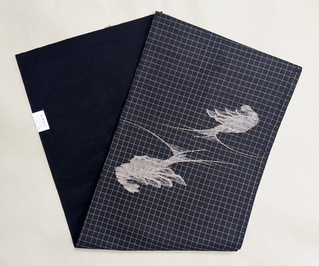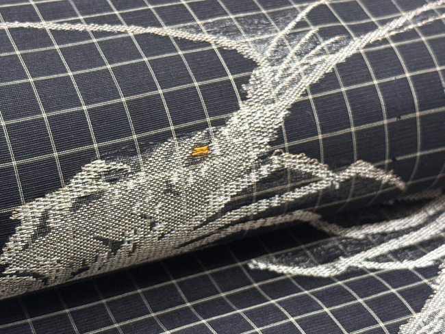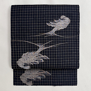 黒地の小格子に今にも動き出しそうにリアルに織り出された海老。 姿は大きいですが、繊細な仕事で品格が感じられます。 織地に少しスレがあります。