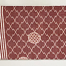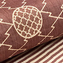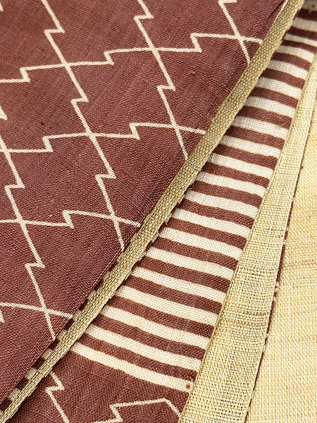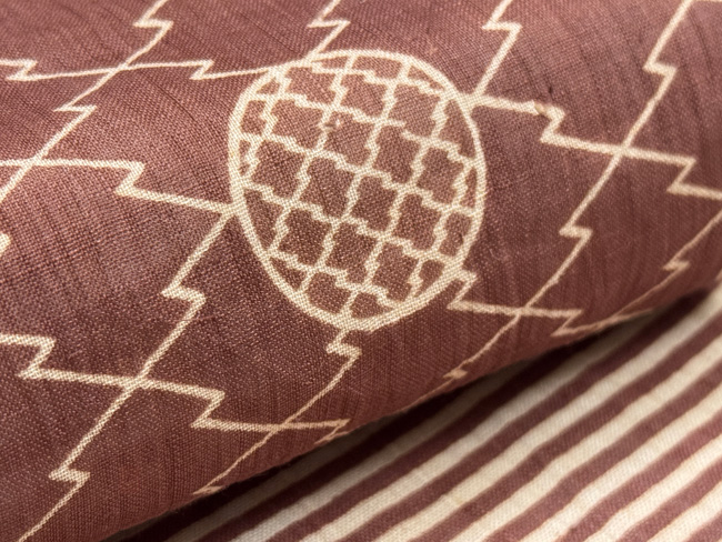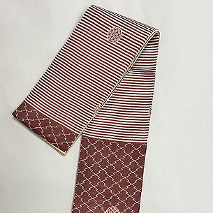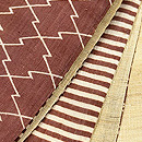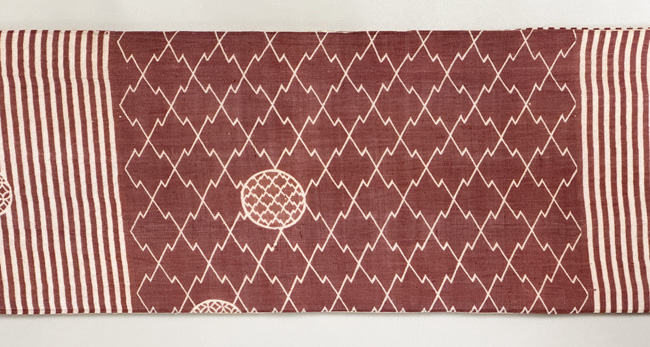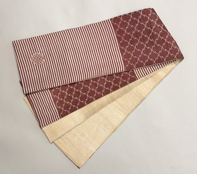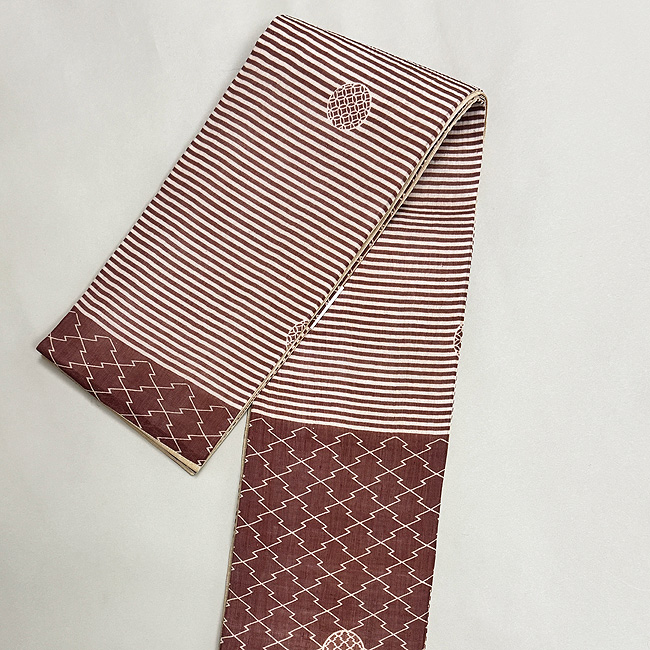 京都の大原女たちが街に行商に出かける時の装束の柄が、麻にベンガラで型染めされています。 かわいくオシャレなデザインを半巾帯にしてみました。