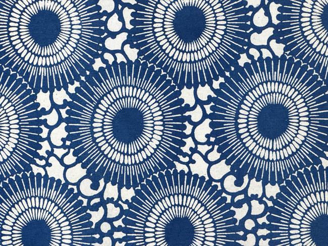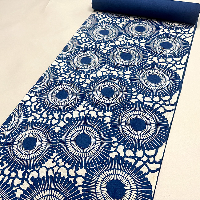 厚手木綿に、しっかりと形置きされた名古屋帯です。 アールデコの感覚を忍ばせる菊と唐草には、地白形に近いものがあります。 奔放でダイナミックなデザインがお似合いになる方に、お勧めしたいです。