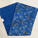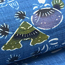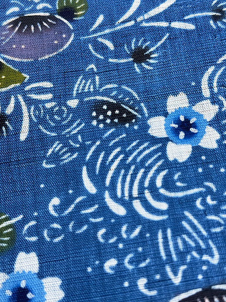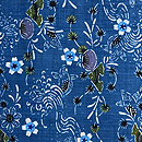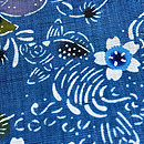 藍色の木綿地に流水や花の文様を散らした本紅型の帯は、藍、白、緑、紫、黒のやさしい色合いが上品です。