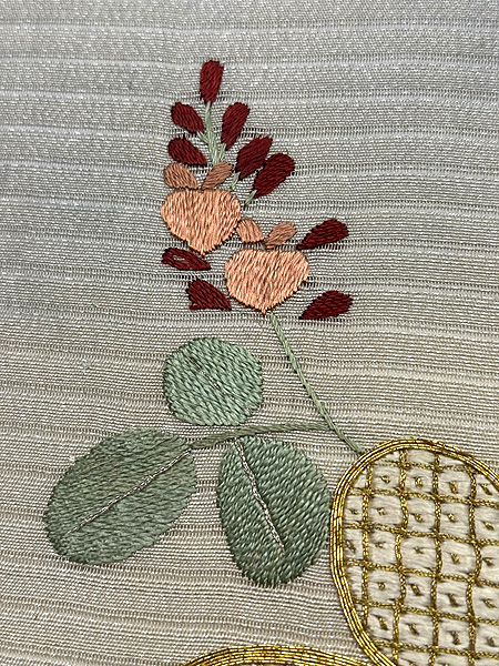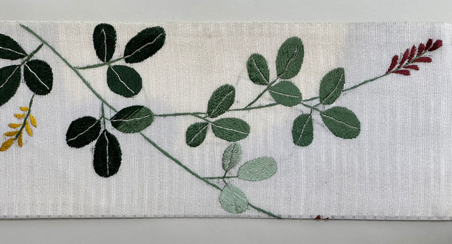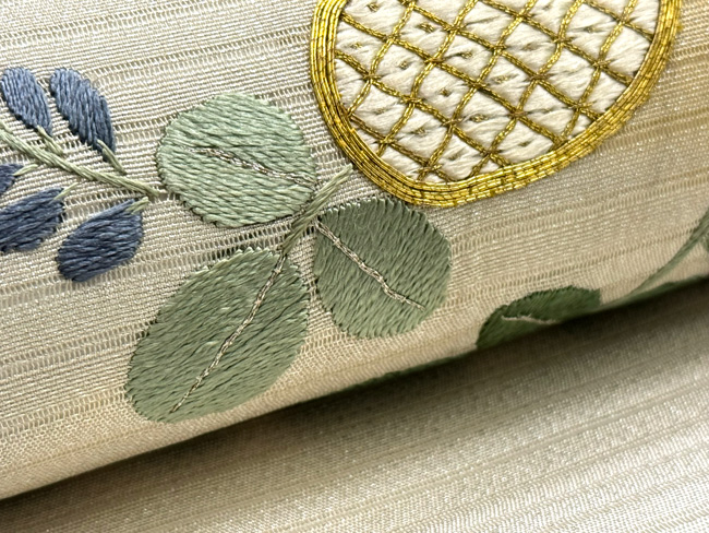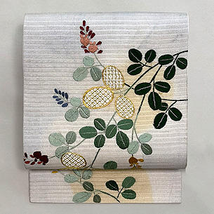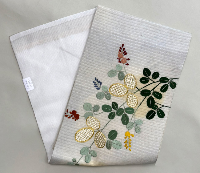 秋に向かう帯の柄としては定番の萩ですが、大きな金駒刺繍がアクセントになって大人の可愛さのある帯になりました。