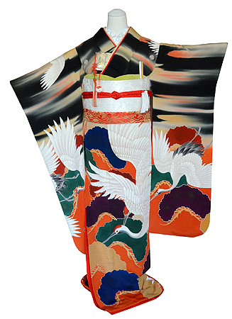 肩周りに優雅にたなびく霞文様、その中を飛び交う丹頂鶴の群。