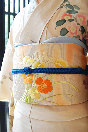 優しいベージュ地にあやめ、牡丹が手描き友禅で染められた訪問着に華やかな刺繍帯を合わせた