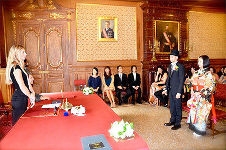 その「結婚の間」の素晴らしいこと。何十年もの間、結婚するカップルを見守ってきたであろう本物が持つ重厚さがひしひしと感じられます。国が異なっても伝統が持つ魅力は変わらないのですね。