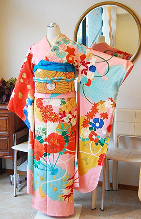 写真の振袖:昭和初期アンティーク振袖(絹100%、手刺繍に友禅染)