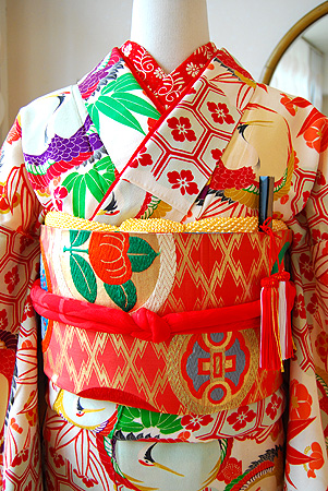珍しい白地に鶴尽くしの文様が印象的な中振袖。