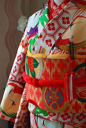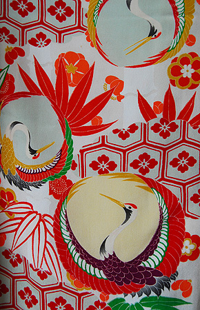 亀甲文様に抱え鶴の鶴丸紋がびっしりと総柄で並んでいます。