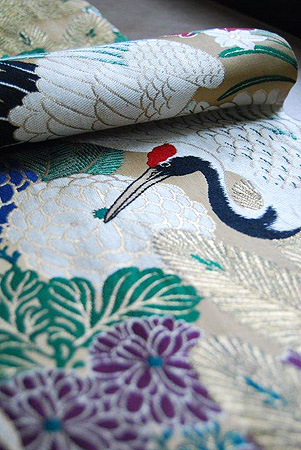 菊に菖蒲、牡丹などの花々に丹頂鶴をモチーフに色彩豊かに織り出された大正時代の丸帯。