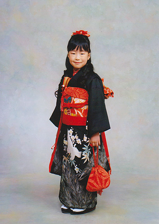 7歳のお祝いをお迎えになられたお客様から素敵なお写真を頂きました。松竹梅文様に、羽を広げ今まさに飛び立とうとしている丹頂鶴。