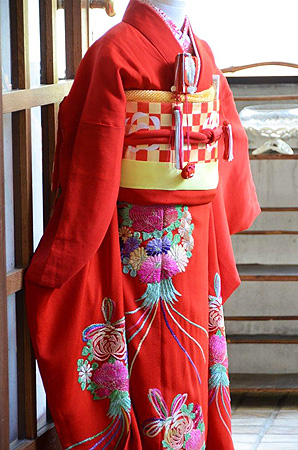 写真:手毬文様刺繍赤金紗縮緬地祝い着(7歳用) レンタル料金一式55,000円