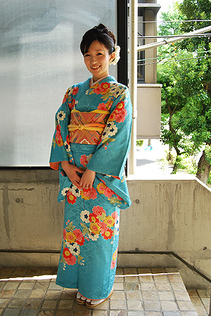 すっきりと落ち着きがちな青系のきものですが、お顔まわりにもはなやかに桜の花がちりばめられとても華やか。