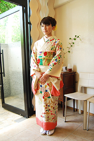 お祝いの席にぴったりの明るく可愛らしい着物です。