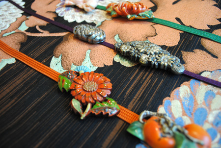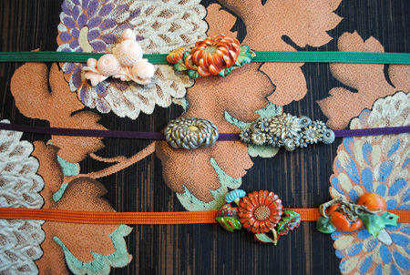 帯留で秋らしさをプラス 菊や柿といった秋らしい意匠の帯留のご紹介です。 昔はこの帯の真ん中の小さな飾りで、さらりと季節感を表現したそうです。 どれもとても凝った作りで、眺めているだけでも楽しい帯留。 この繊細なデザインを引き立たせるためには、少しだけ帯をシンプルにするのがおすすめです。 帯締めとはひと味違う着姿になりますので、レトロ好きな方は是非一度お試しください! 店内ショーケースにございますので、ご希望の際はスタッフまでどうぞ。 帯留 オプション 3,000円 吉田