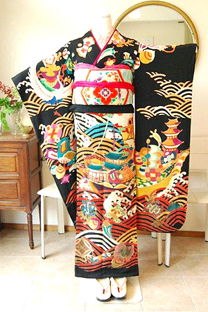 シックな黒地に鮮やか青海波の図案が斬新なアンティーク振袖。