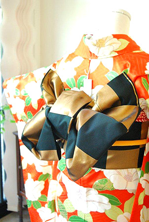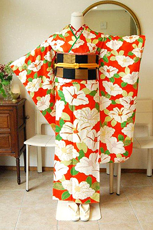 パッと目を引くオレンジ色の地に大きな椿の花が散りばめられた華やかな振袖。