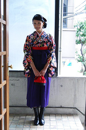 足元がブーツなので草履の時に比べて、短めの袴を合わせバランスよく着付けをさせて頂きました。