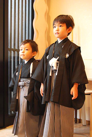 お母様のリクエストにより、きりっと硬派な黒紋付に縞の袴でご兄弟仲良くお揃いです!