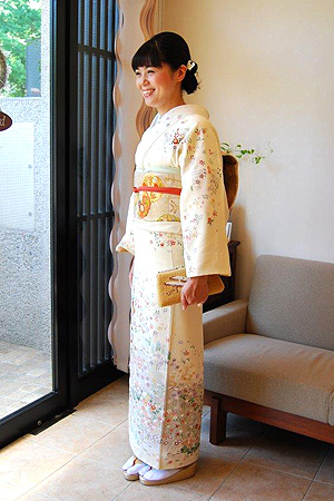 夏の始まりを感じさせる暖かな陽気ですが、まだ袷の着物の季節ということで、見た目だけでも涼しげにと淡いクリーム色のお着物をお選び頂きました。