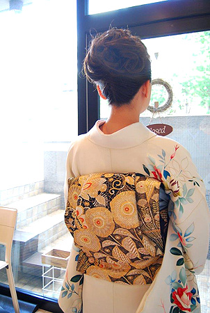 帯結びは七宝文様を取り入れた縁起の良いアレンジにさせて頂き、小物もあえて色を足さずに着物から一色を取り、寒色系のモダンな着こなしとなりました。