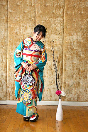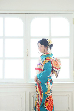 成人式の前撮りでお選びになられたのは、鮮やかなターコイズブルーの錦紗縮緬地に