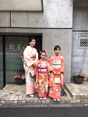 ご姉妹揃って着物で七五三☆お姉様は妹様の祝い着と濃淡をつけた桃色綸子地の小振袖、お母様はお嬢様お二人が引き立つよう白ぼかし地の加賀友禅訪問着をお召し頂きました。