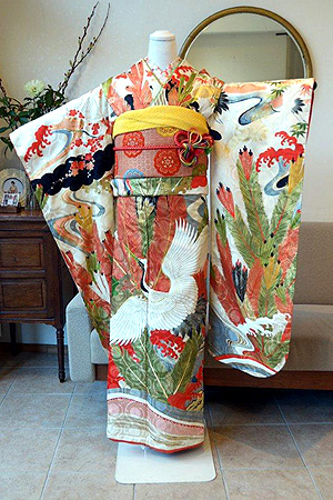 羽根を広げ飛翔する丹頂鶴に松文様が描かれた白地の振袖。